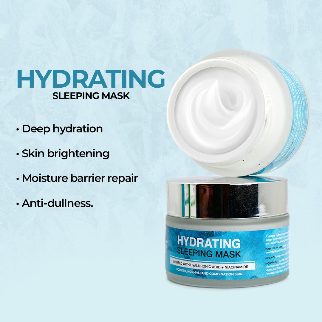 A deeply hydrating overnight mask designed to replenish moisture levels and brighten the skin while you sleep. infused with Hyaluronic Acid & Niacinamide, it locks in hydration, restores skin elasticity, and evens out skin tone, leaving the skin plump, smooth, and radiant by morning.